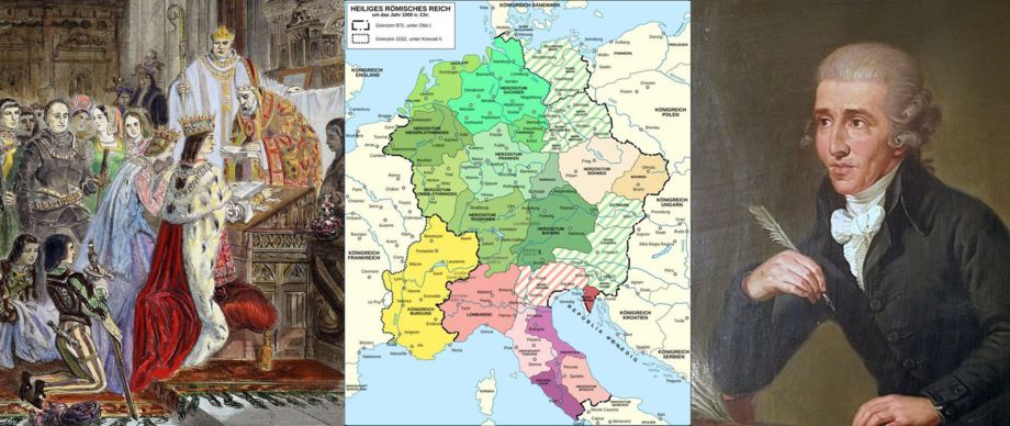 Die Titelbilder: Links: Der jugendliche Papst Johannes XII. (* 937 oder 939) krönt 962 den 49-jährigen König Otto I. zum Kaiser der Römer. Mitte: Das Heilige Römische Reich um das Jahr 1000. Rechts: Joseph Haydn (* 1732) um 1770, Komponist der 1797 uraufgeführten Kaiserhymne.