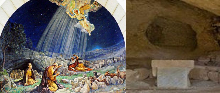 Die Titelbilder: Links: Engel verkünden den Hirten die Geburt Christi (Quelle. ICEJ (Internationale Christliche Botschaft (Embassy) Jerusalem)). Rechts: Bildausschnitt aus einer Höhle bei Bethlehem mit einer Phatne (Einhöhlung an der Höhlenwand). In eine solche ist Jesus nach seiner Geburt, gebettet in Heu und Stroh, hineingelegt worden (Quelle: Klaus Ammich, Buttenwiesen).